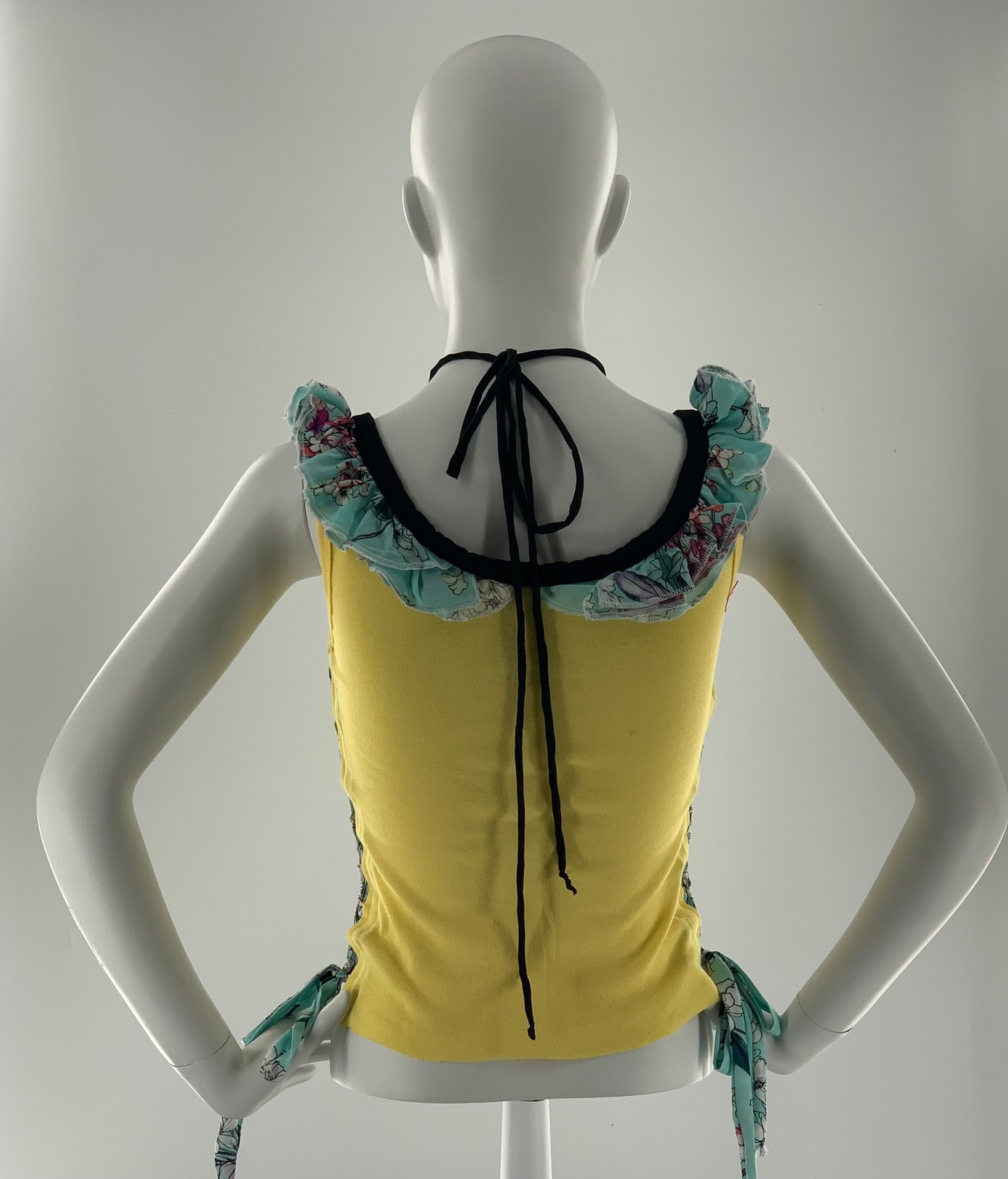 Lace Up Cropped Top with Ruffled Straps & Silk Flower | Yellow