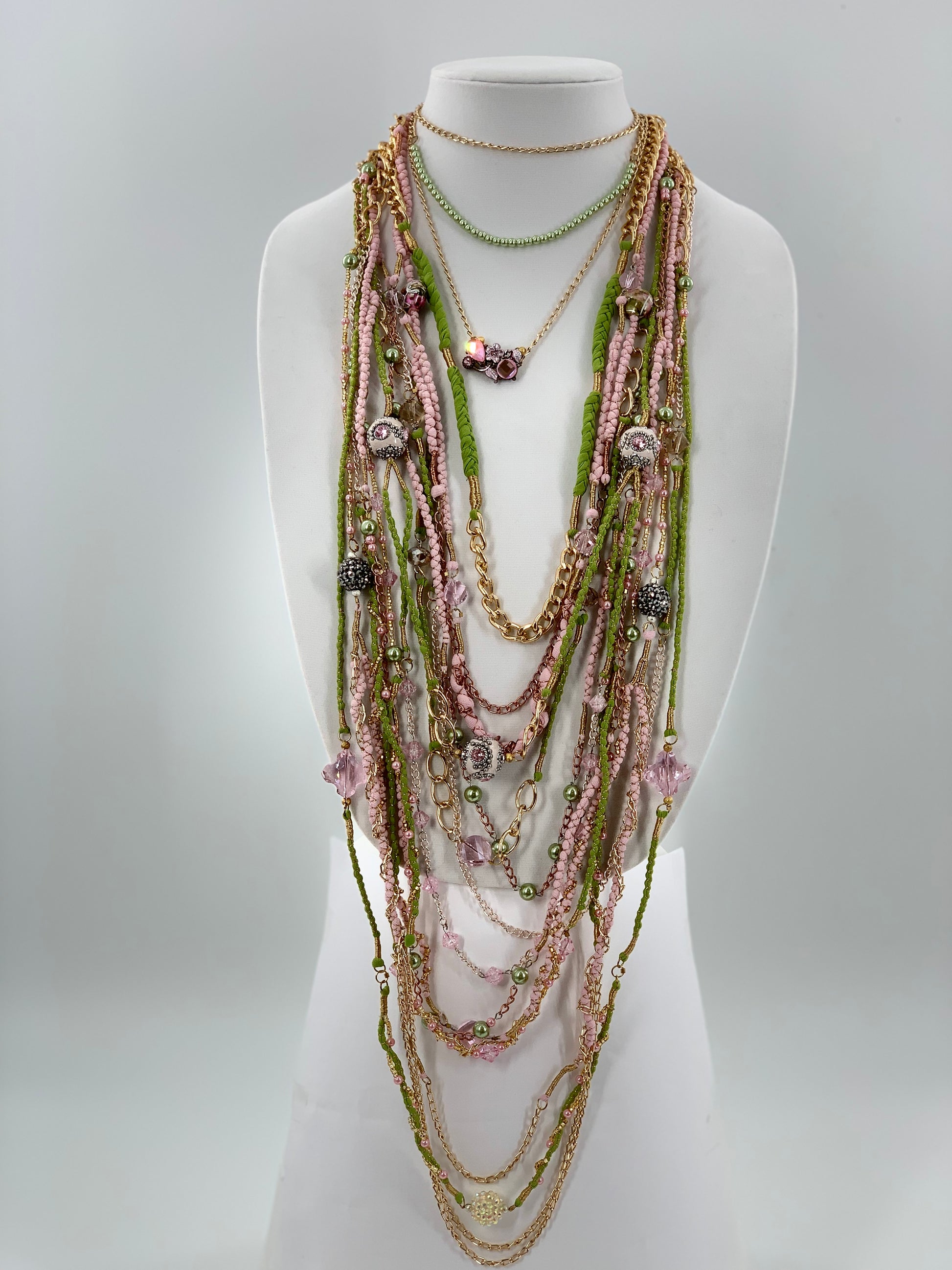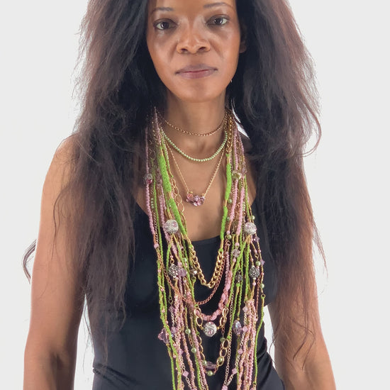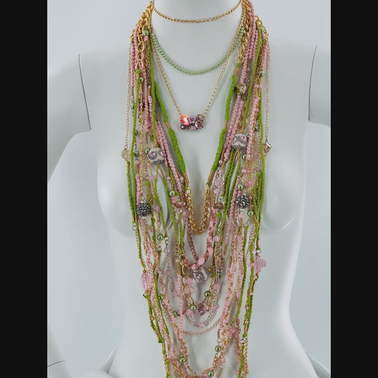 Green & Pink Layered Necklace With Gold, Brass and Nylon Chain and Specialty Glass Beads